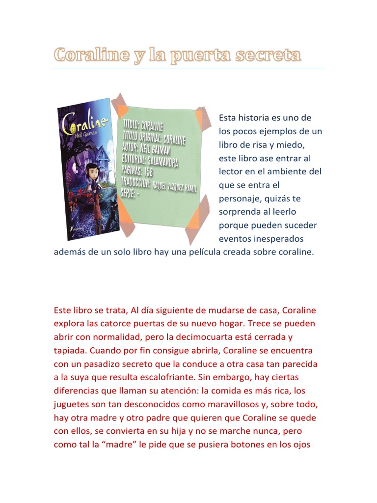 Forums coraline y la puerta secreta 2 libro coraline y la puerta secreta. La verdad me encanto la película y investigue que hay un libro sobre esta película de neil gainam y he estado buscando link , pero no puedo descargarlo , ayuda , por favor !!
